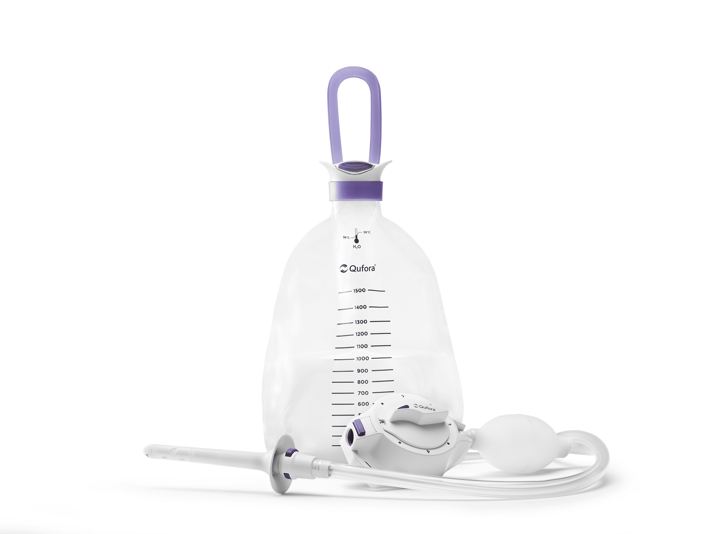 Qufora IrriSedo Klick is designed for ease of use, to give a feeling of confidence during bowel irrigation. It is developed for bowel irrigation seated on or over the toilet and is suitable for people who need the support of a water-inflated balloon that holds the catheter in place during irrigation.